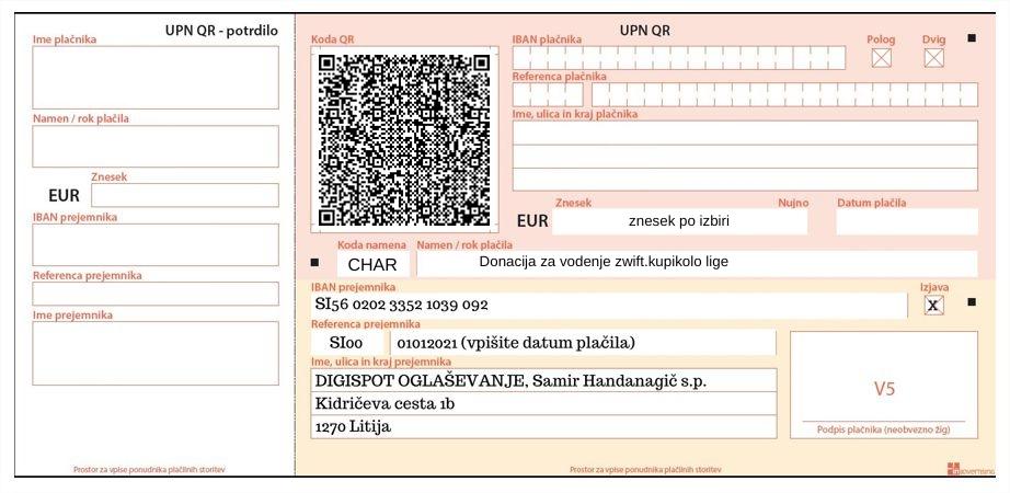 Za tekmovanje v Zwift.Kupikolo ligi se lahko prijavite na spodnji povezavi www.zwift.kupikolo.si/prijave. Prijavnina za udeležbo v Zwift.Kupikolo ligi za tekmovalca je BREZPLAČNA. Lahko pa seveda v podboro in vodenje lige prispevate svoj prostovoljni prispevek kot DONACIJA. To zagotavlja vključenost v vseh 12 tekem, ki se bodo odvijale v obdobju od 19. 11. 2025 do 19. 2. 2026. Vaš prostovoljni prispevek lahko izvedete na podlagi prikazanega univerzalnega UPN naloga. (slika spodaj)